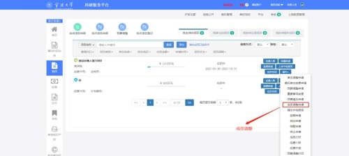 4. 进入项目组成员,请确认成员是否完整。特别是项目中有学生的参与的,请完善学生身份类别。成员信息有问题的,进入科研系统主页,左侧的项目界面,点击操作下拉框下的成员调整申请,进入成员调整界面进行添加和修改,待项目主管审核之后,会自动补充到项目经费公开一览表,最后再提交即可。