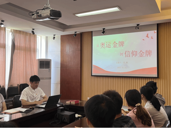 党员代表沈航以《从奥运金牌到信仰金牌》为题进行微党课宣讲。他从刘长春孤勇赴奥运讲到北京冬奥辉煌,用历史案例与体院师生实践,诠释体育强国背后的信仰力量,号召青年党员以训练场为战场,让金牌闪耀信仰之光,赢得全场热烈共鸣。